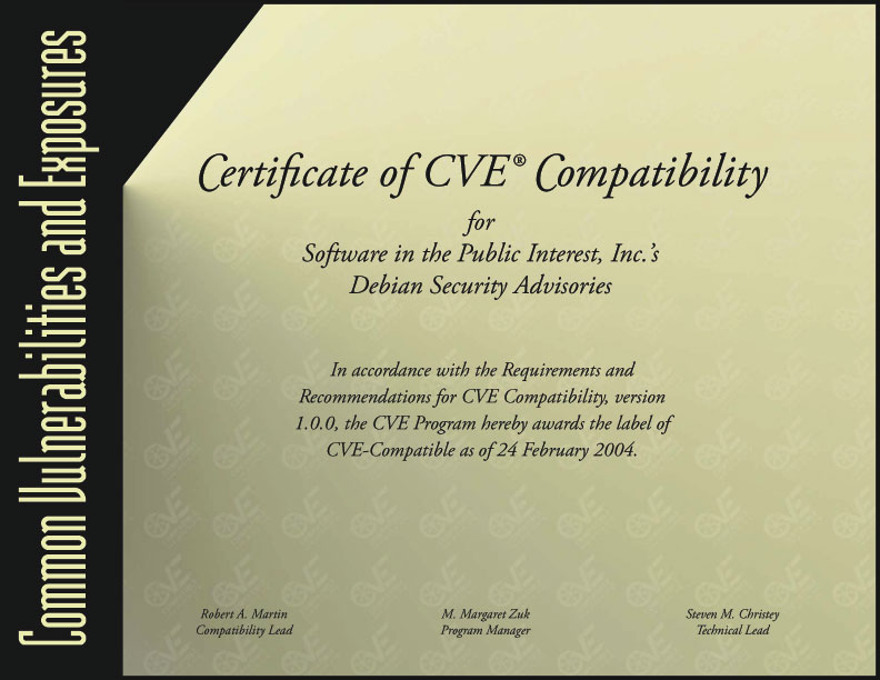 Debian Security Advisories were declared CVE-Compatible on February 24, 2004. More information is available at the CVE site, including the capability questionnaire.